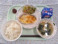 ・牛乳・ご飯・鮭のポテトチーズ焼き・野菜のごま酢和え・大根のみそ汁・ひとくちぶど...