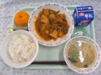 ・牛乳・ご飯・味つけのり・お魚アーモンド・韓国風肉じゃが・卵スープ・みかん