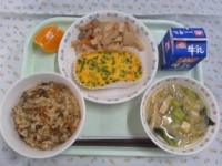 ・牛乳・五目豆御飯・千草焼き・大根と車麩の含め煮・白菜のみそ汁・早香