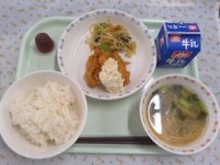 ・牛乳・お魚アーモンド・ご飯・白菜の柚子香漬け・揚げじゃがいものそぼろ煮・わかめ...