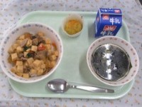 ・牛乳・豆腐のうま煮丼・中華わかめスープ・スイートポテト