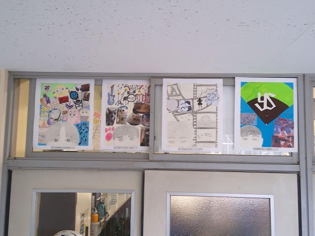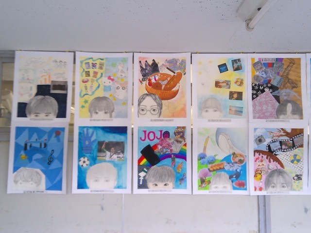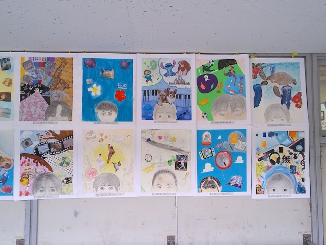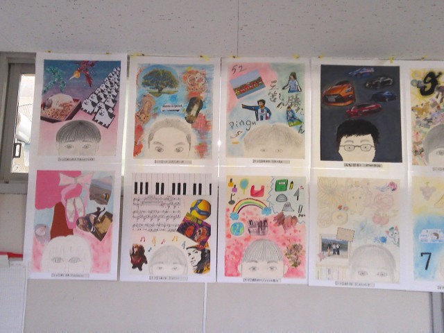 3年生の廊下には、美術の授業の作品が掲示されています。自画像とともに、自分の頭の中にあるものを表現しています。頭の中のものは、写真を貼ったり自分でイラストを描いたりして表現し、個性が出ています。日頃知らなかった一面が見られて、楽しい作品になっています。