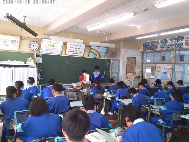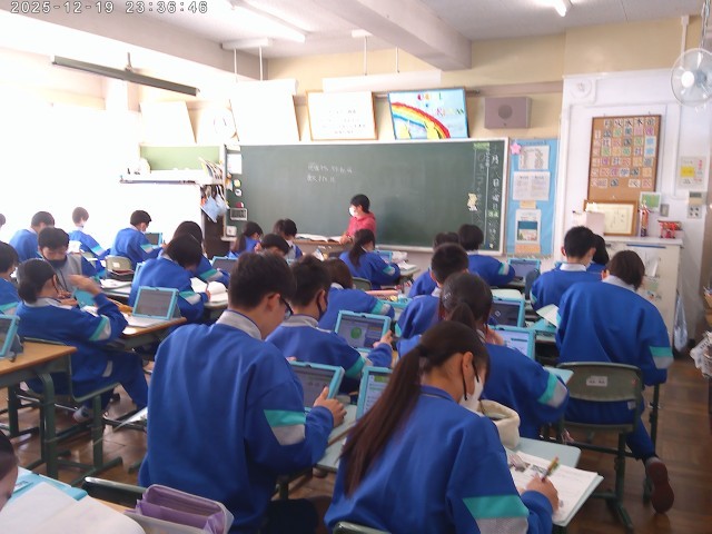 2学期も残すところあとわずかとなりました。教科の授業も、今週でほぼ終わりです。1年生の社会の授業では、プリントに2学期のまとめをしている生徒もいれば、タブレットを使って社会の問題を解いている生徒もいました。問題を解いている生徒は、自分のペースで復習ができるのと、正解をするとアプリの中でポイントがたまるようになっているので、成果が目に見えて楽しいようでした。