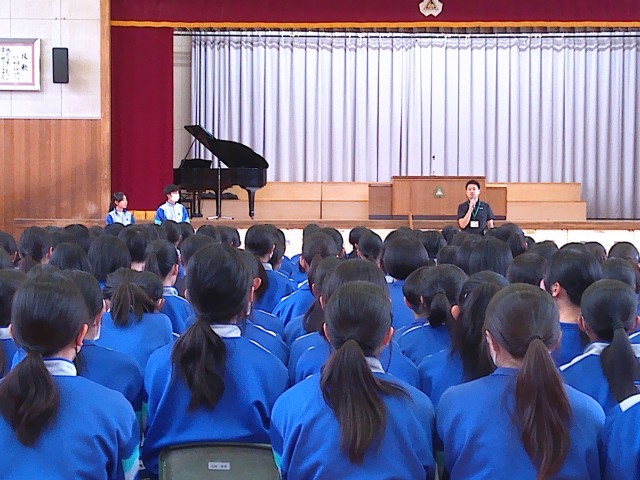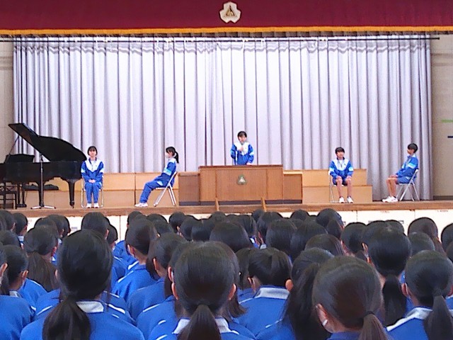 今日から1・2年生の卒業式練習が始まりました。今日は、座席の位置を確認しました。生徒会が中心となり指示をだし、スムーズに席が決められました。礼法についても、生活委員の生徒が手本を見せながら練習をしました。短時間できちんとできたので、歌の練習もしっかり時間をとることができました。