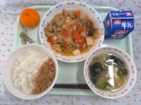 ・牛乳・ご飯・ししゃもの唐揚げ・生揚げと野菜の煮物・キャベツと油揚げのみそ汁・ネ...