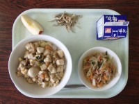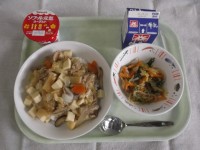 本日のメニュー:牛乳 豆腐のうま煮丼 春雨サラダ 煮干しアーモンド りんご豆腐の...